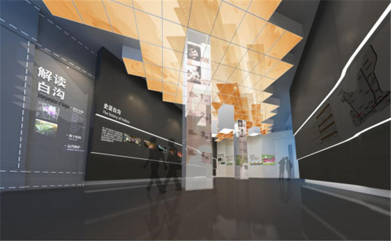 白溝規劃展覽館布展面積約3500平方米,展館展示區域共兩層,一層分為序廳、解讀白溝、聚焦白溝、擎畫白溝四部分,二層分為規劃白溝、實力白溝、筑夢白溝三部分。整個展廳以“和諧·跨越·大白溝”為主題,集城市展覽、規劃公示、宣傳教育等多功能于一體,展示白溝的城市歷史、建設成就和未來規劃等。