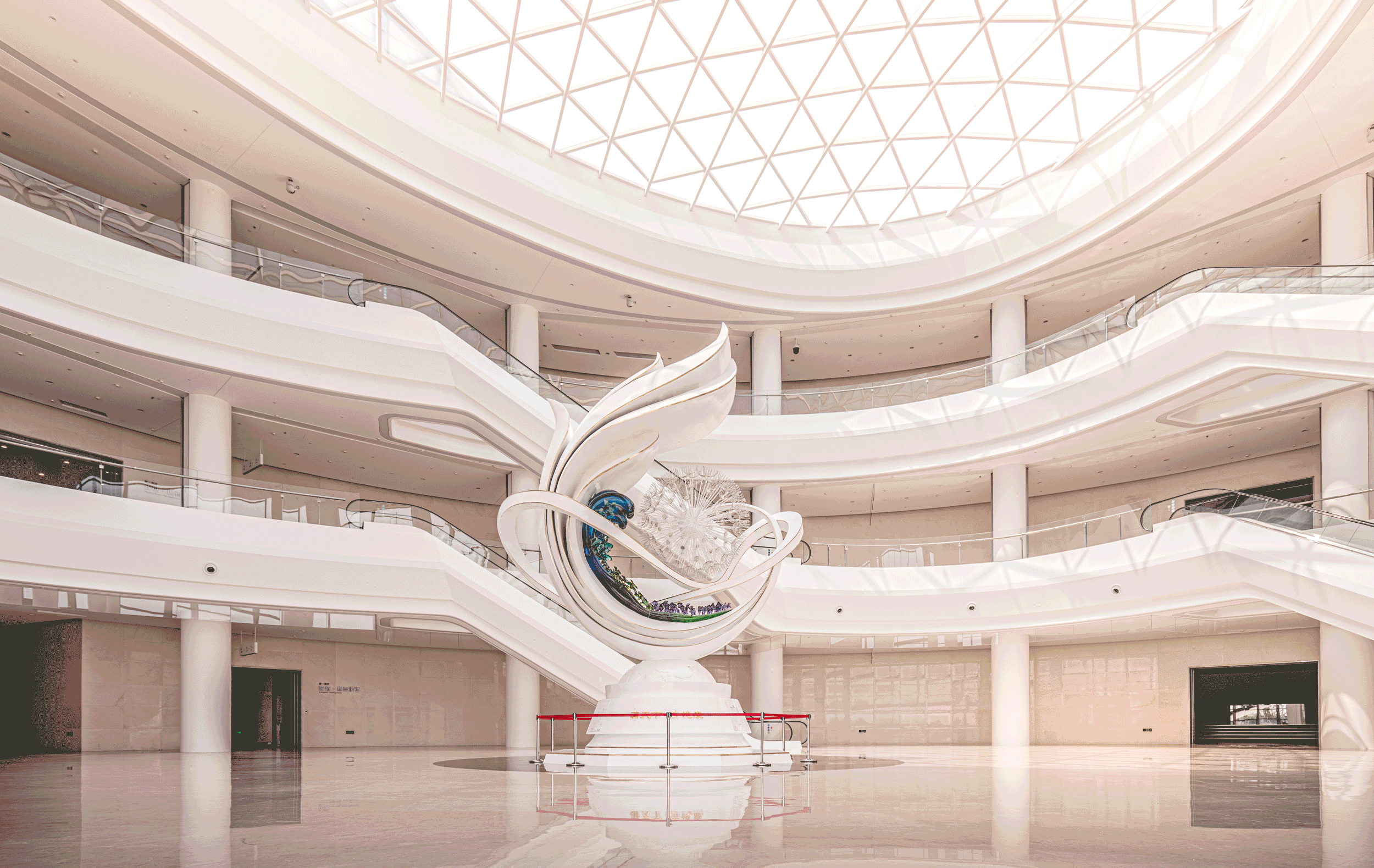 揚子江龍鳳閣項目二樓大廳采用雙曲面穹頂的設計風格,倒“U”字型頂面分布著1200個龍鱗造型。設計師運用彩色燈帶配以鱗狀裝飾,與大堂色調完美融合,給參觀者以全新的空間體驗。創新研發“超高預鑄式玻璃纖維加強石膏板變色龍鱗吊頂”工藝,除了實現更好的造型效果之外,還防火防潮、擁有良好的隔音效果,優化了施工工藝,縮短了施工工期。