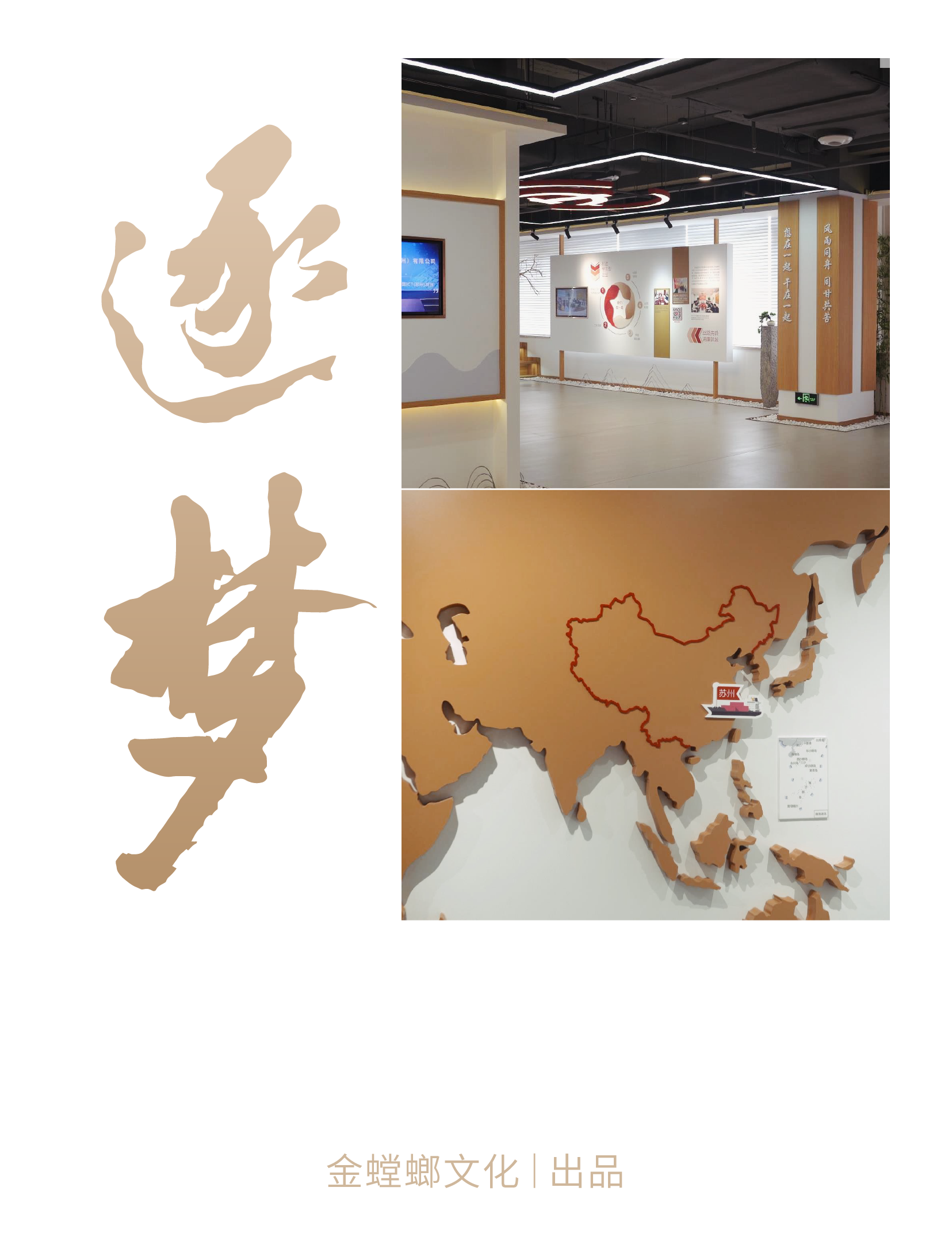 一輛輛貨車有序駛過 窗外物流中心各色集裝箱堆疊 在新城黨建綜合陣地 竹影搖曳,木色溫潤 細細述說新城逐夢發展之旅 蘇州新城投資發展有限公司是蘇州市國資委管理的市屬國有企業。 公司以姑蘇平江、滄浪、金閶三新城開發建設為起點,積極搶抓“一帶一路”、長江經濟帶、長三角區域一體化、自貿區等重大戰略疊加機遇,逐步形成城市建設、運營、服務和現代物流兩大主業。 金螳螂文化出品蘇州新城投資發展有限公司逐夢館,承載黨的文化,延續并傳遞企業精神。 設計中融入中式元素與企業特色符號,定制化呈現不一樣的黨建綜合陣地。 逐夢館由序廳、主責主業、新城黨建、未來展望幾個部分組成,以鮮明的市黨委精神為主線,貫穿場館的理念、視覺、環境、行為、文化、構建和諧統一的文化體系。 金螳螂文化設計團隊通過分析蘇州市的地域文化和人文精神,風土風貌,從中挖掘所在地區的文化屬性。 創新設置時間軸互動展項,轉動手柄即可直觀了解企業大事記,回顧企業發展歷程。 在介紹現代物流業版塊,運用滑軌移動屏清晰闡釋企業的業務構成。 新城新起點,共創新發展。從江南水鄉到三秦大地,金螳螂文化為博物館、規劃館、科技館、美術館、城市文化館、主題樂園、歷史街區等客戶提供空間環境藝術策劃、設計、多媒體與場景藝術創作、布展施工整體解決方案,詮釋空間故事,彰顯文化價值。